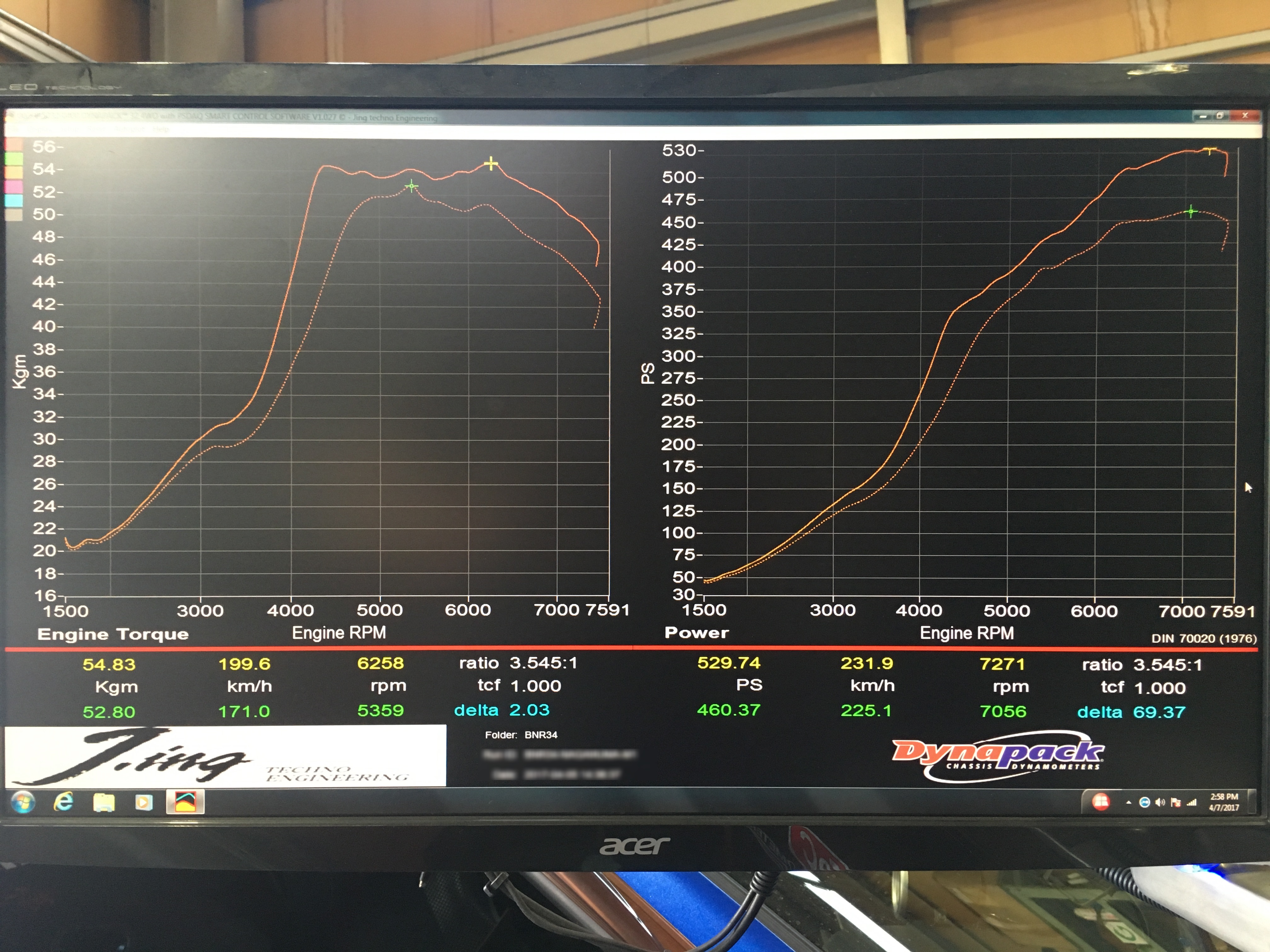 BNR34ですが、GT-SSタービンとHKS256カムが入った状態で何年か前に弊社にてV-Proでセッティングした時の性能と同一条件下でのMoTeCとのセッティングの比較です。