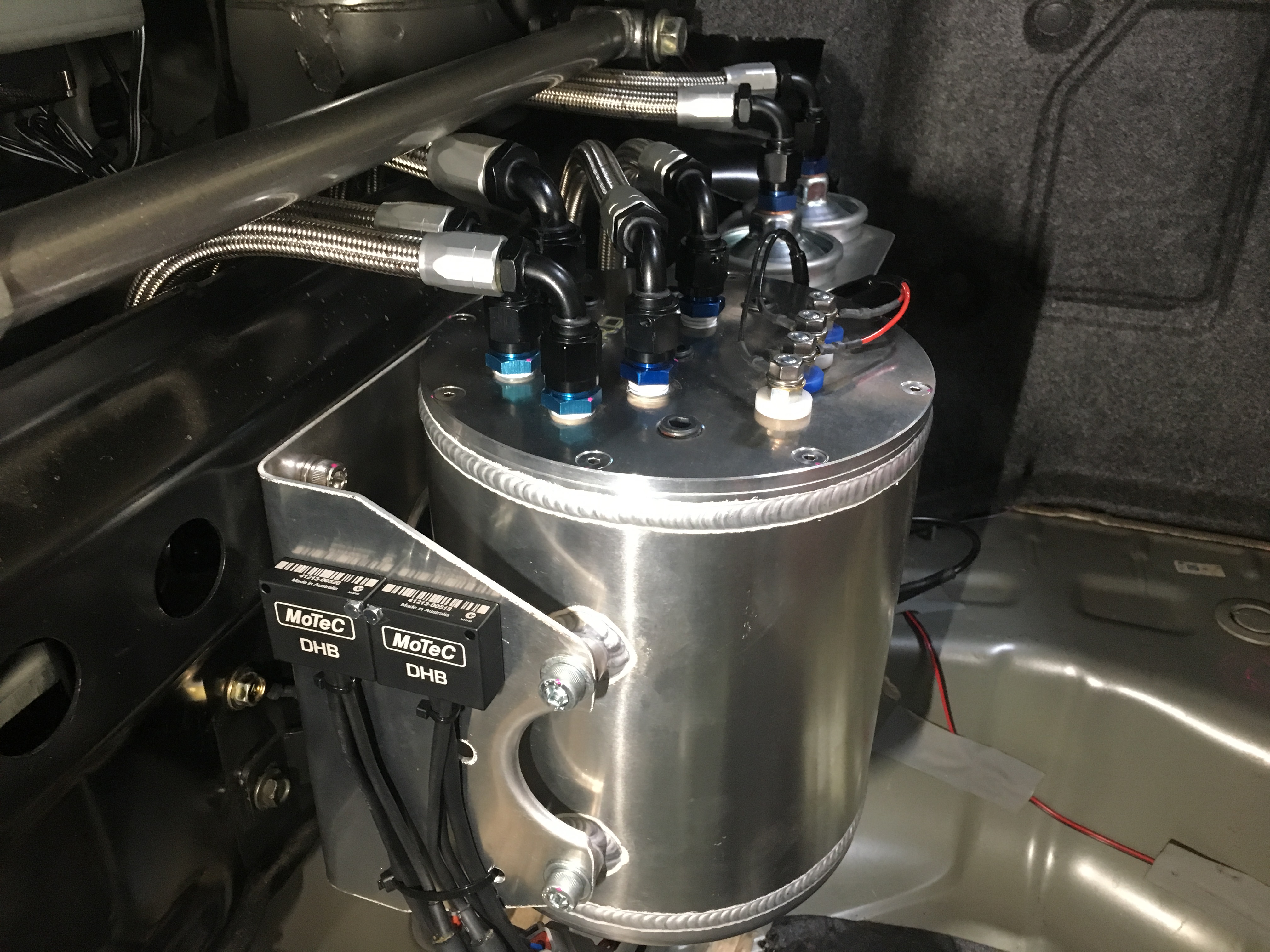 燃料ポンプはコレクタータンク内に2基掛けで、ポンプ音が煩いと言う事が無いようにMoTeC DHDを使用しアイドリングや低回転域では、ポンプ回転数を下げ音が出ないように制御しています。