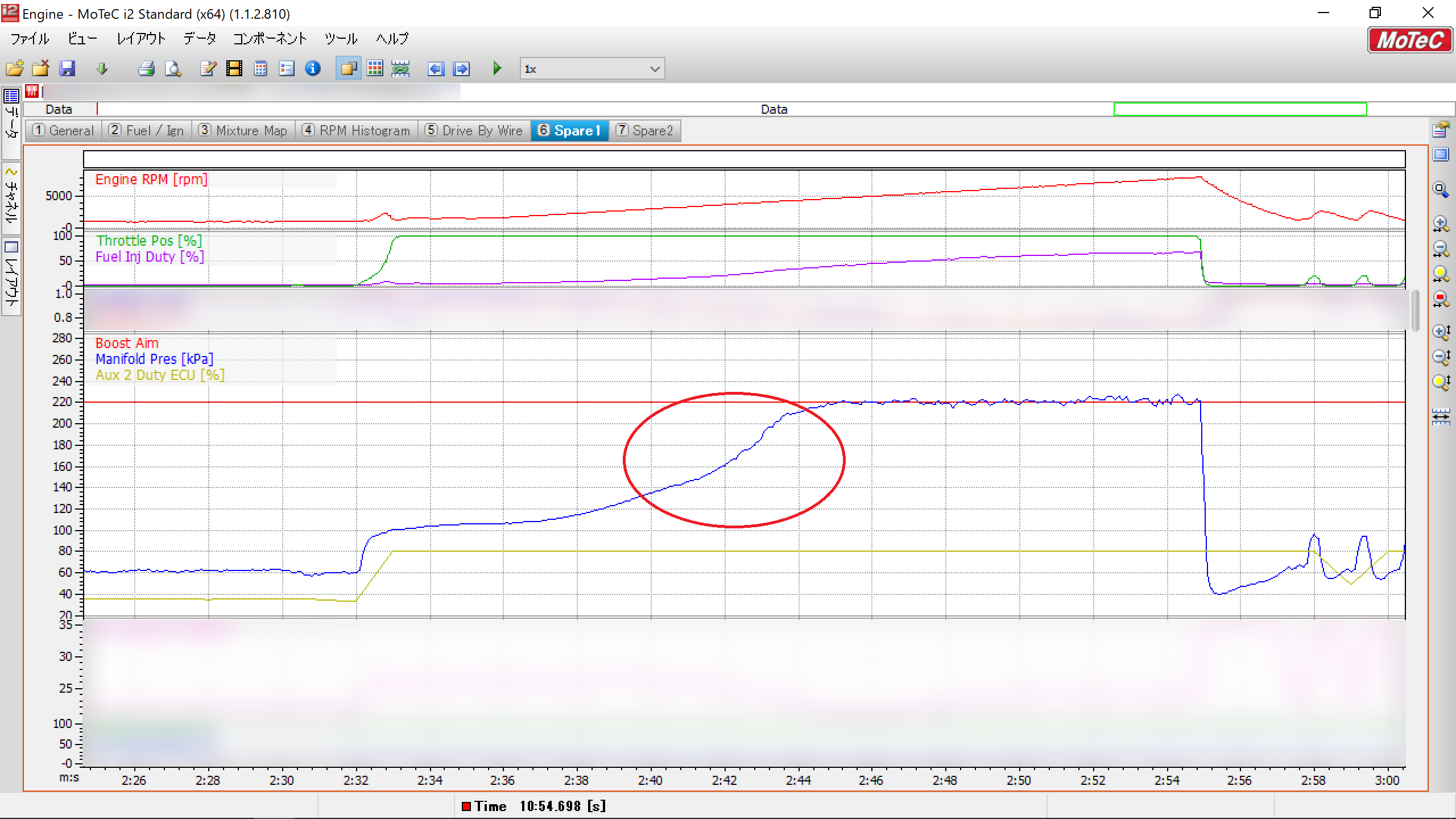 その状態で純正ECUで書き換えしてブーストを多少上げたとしても性能が向上するのは設定ブーストに入ってからの4000rpm付近からでブーストが立ち上がる所はノーマルと何も変わらない。