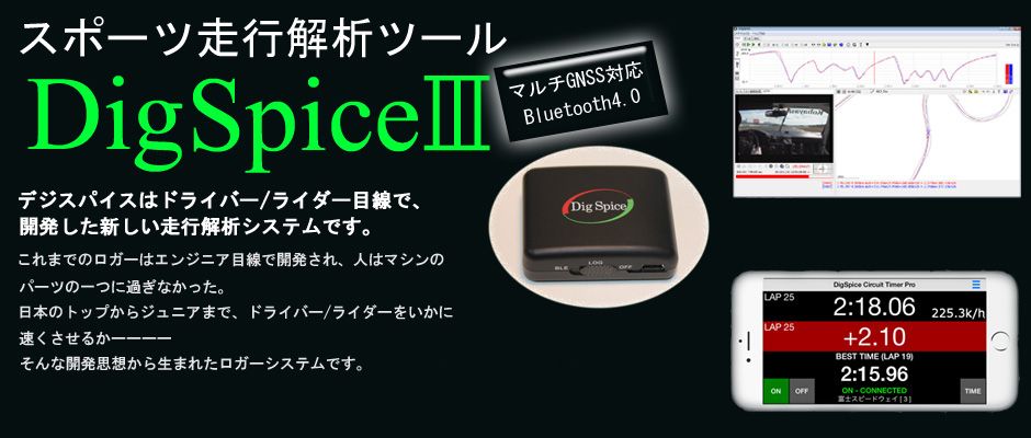 DigSpiceⅢ(デジスパイス)と言うGPSを利用した解析ツールがあります。サーキットなどの走行ラインやブレーキポイントや他多彩な機能を持った手のひらに載るほど小さなGPS解析るがあります。