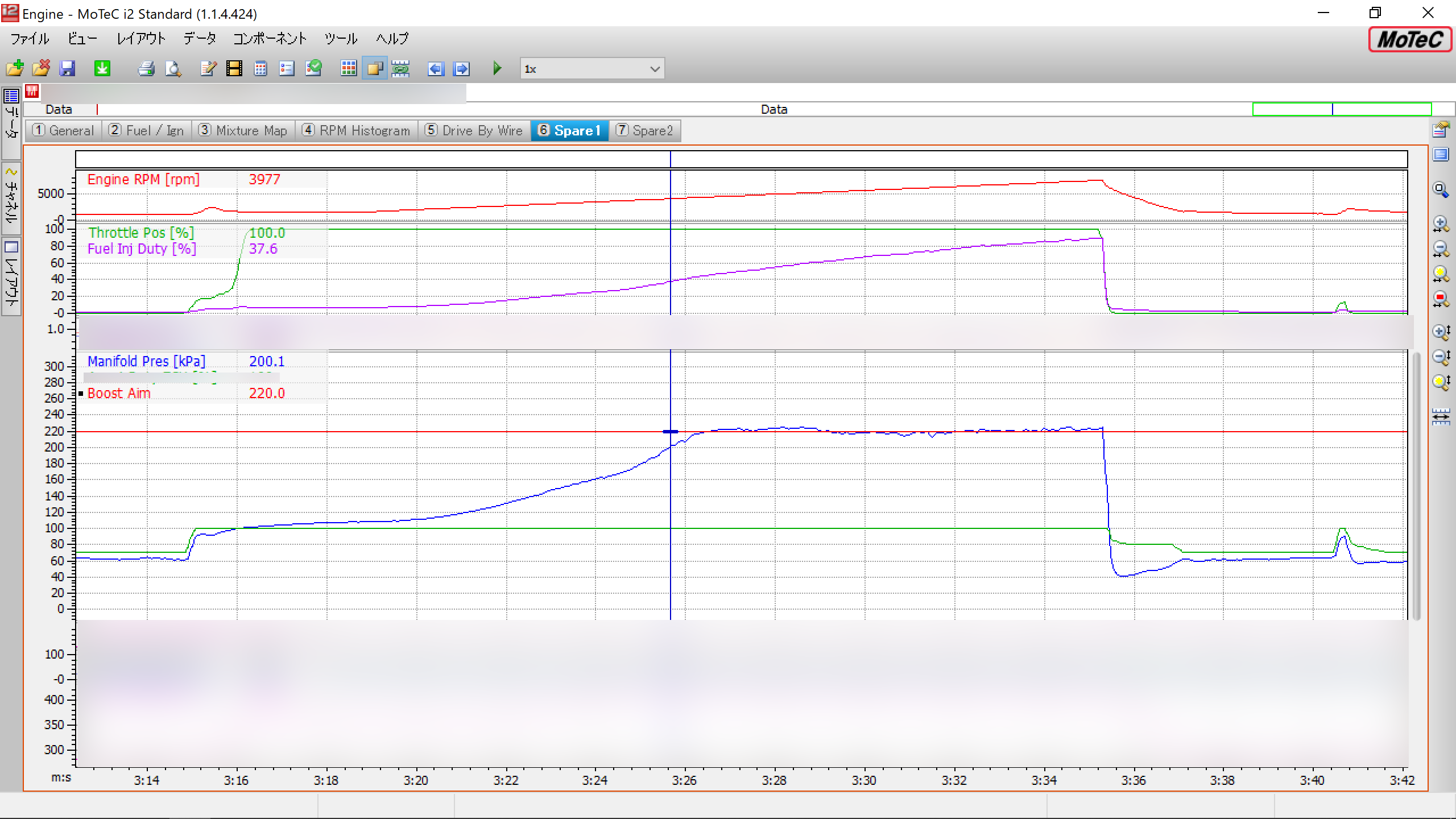 エンジン内部ノーマルでREINIK-Gr.Aカムとの組み合わせでは、エンジンのコンディション次第でJe7-STは4000rpmで200kpaに到達するようになります。