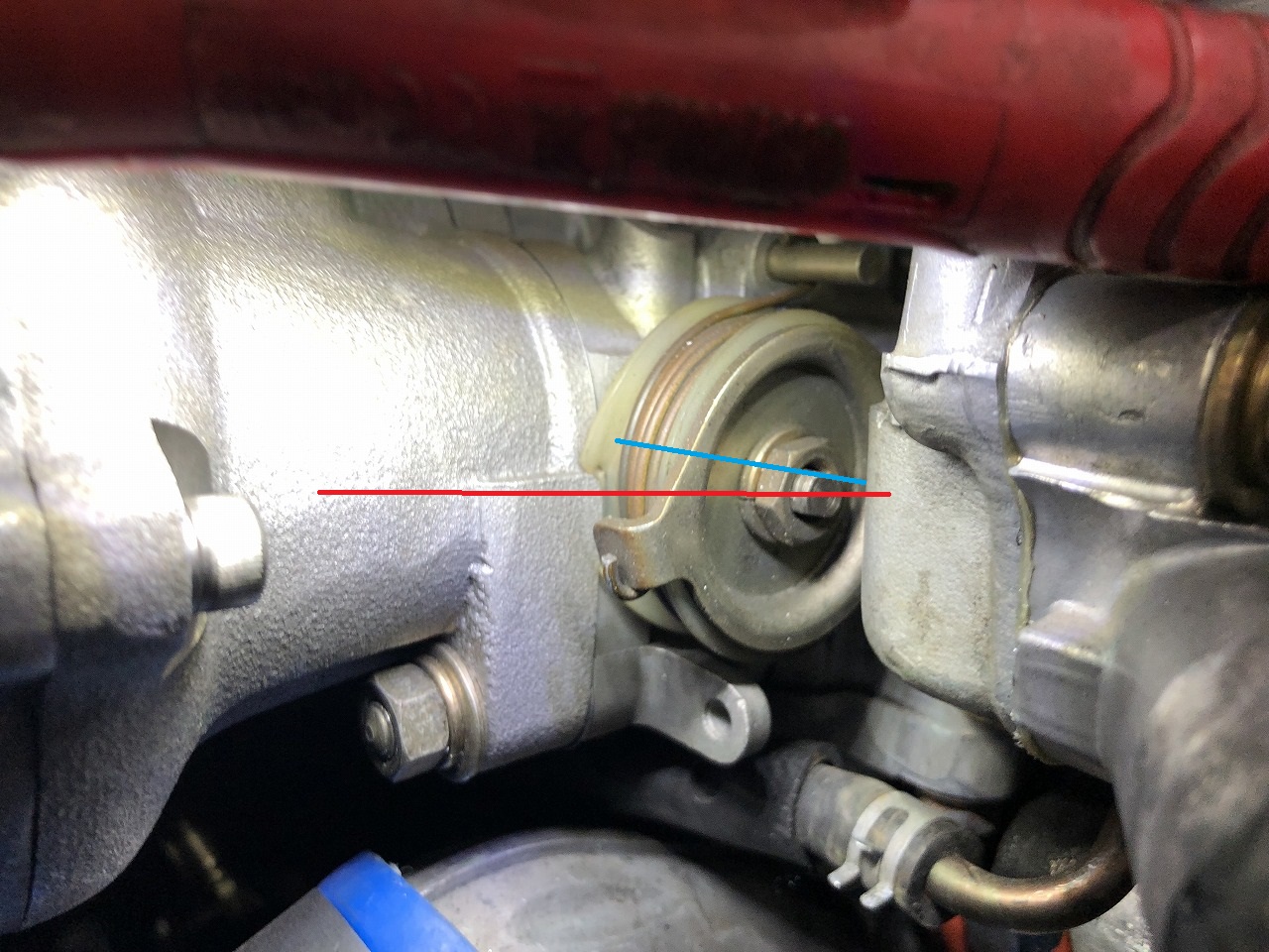 事例で画像を添付していますが、アクセル全開時(青線)ストッパーに当たっていますが80%~90%しか開いていません。