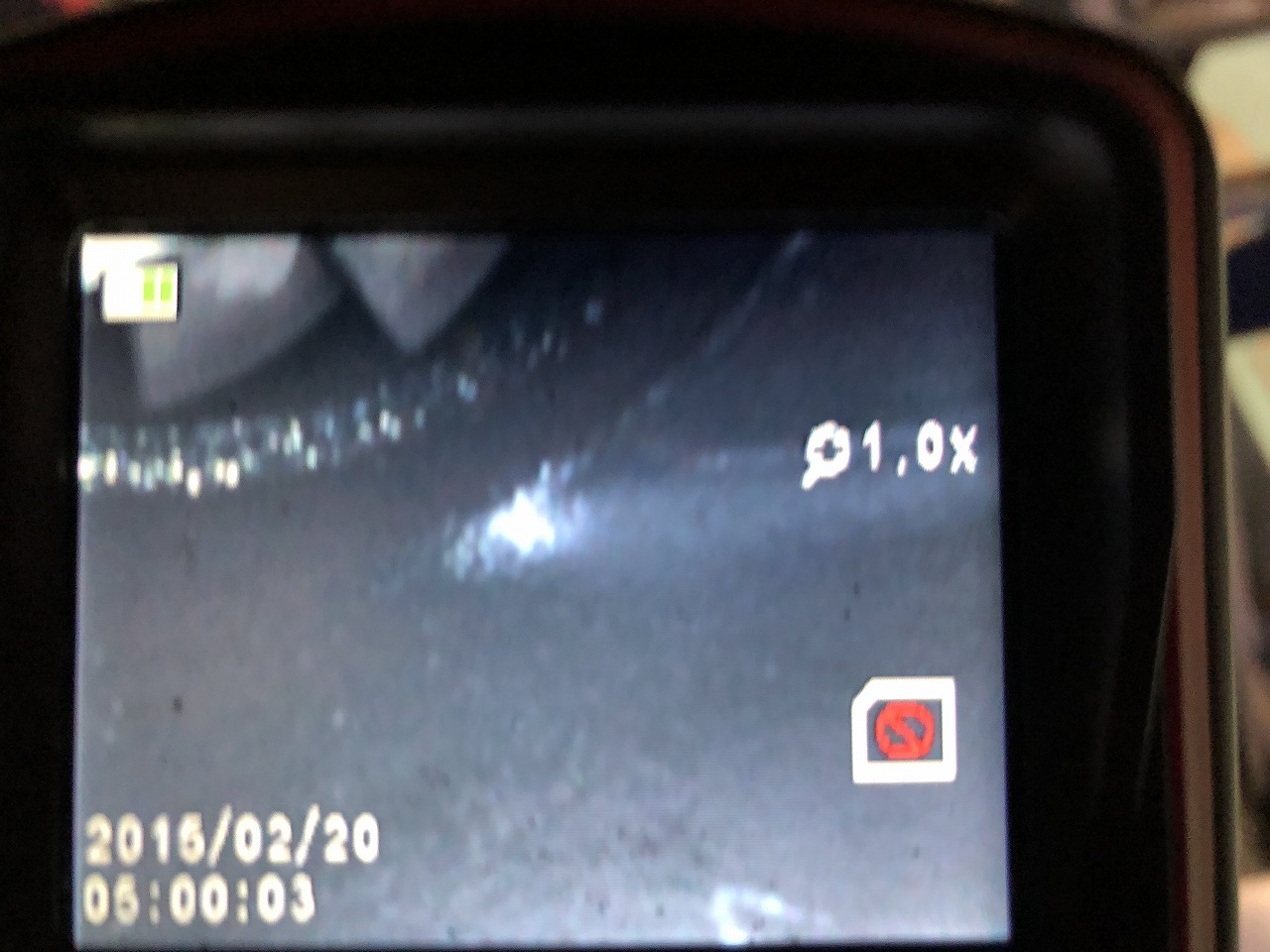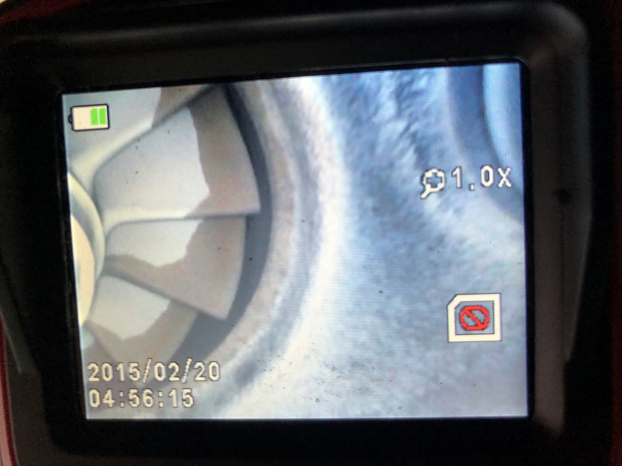 白煙の原因を点検するために一度アイドリングで5分程度回し白煙を確認後にマフラーを外して、ファイバースコープをアウトレット側から覗き目視確認。