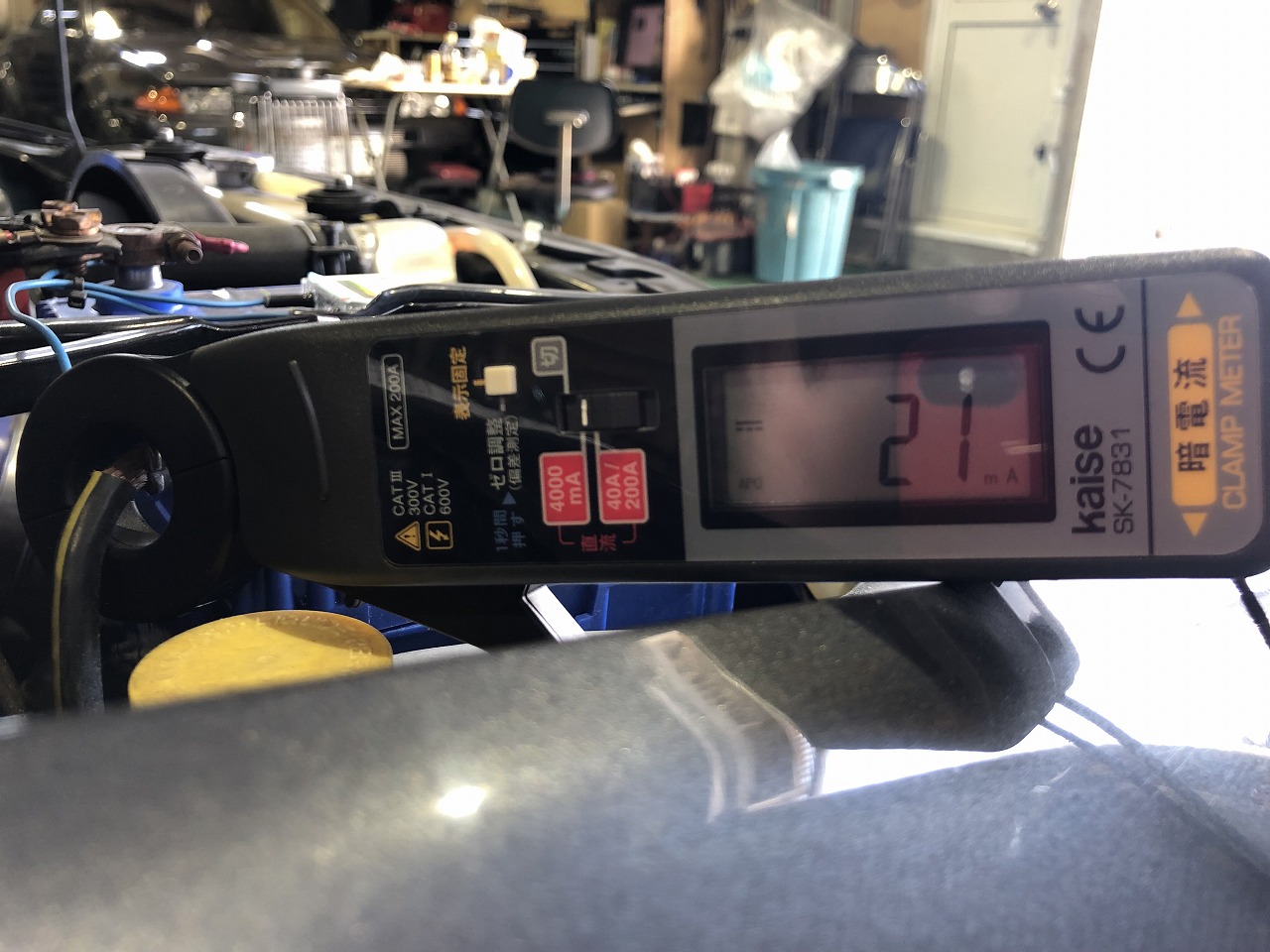エンジンを始動した状態で電流測定をしながら負荷を掛けた時の電流値を確認したいる状態で、ブースターケーブルを使いマイナス端子からボディやエンジン本体に繋いでみると電流がガクンと下がりました。