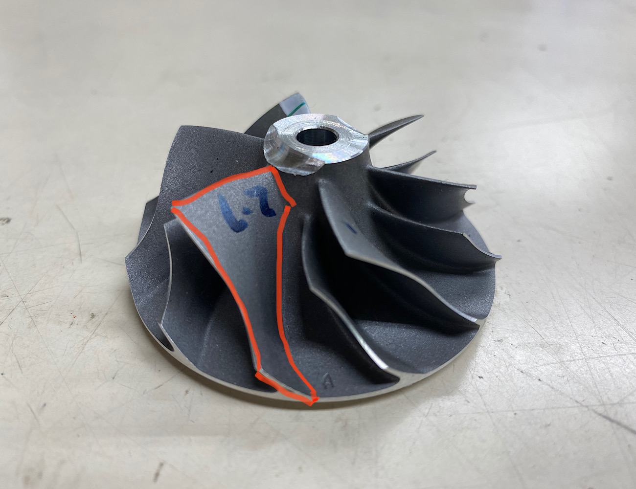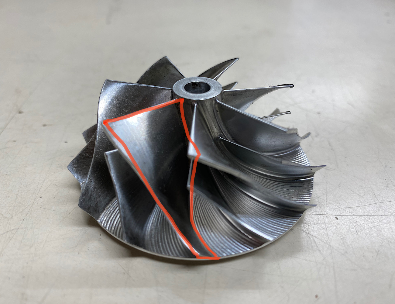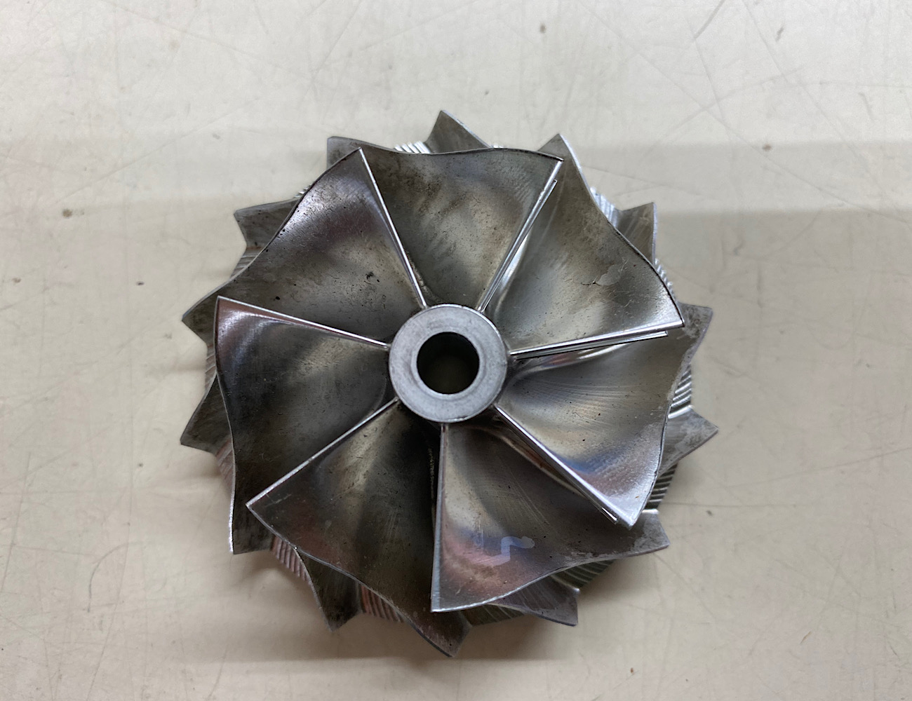 ビレッドで作るメリットはブレードセンターの柱の部分を細くして、羽1枚1枚の面積を大きくする事で、小さなブレードでもワンランク上のタービンと同等の性能を出す事が出来るんですよ。