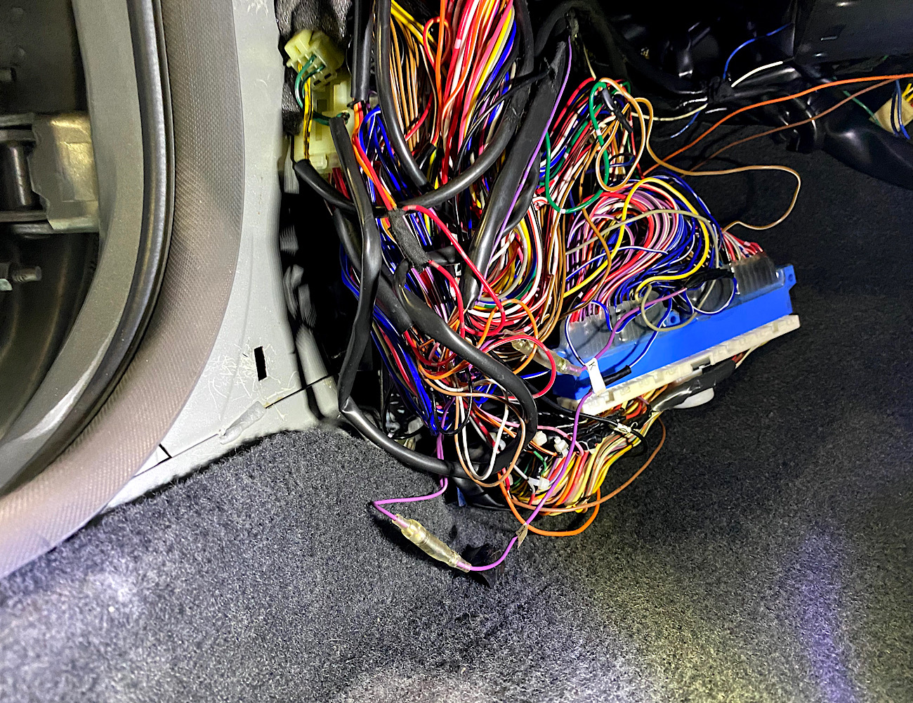 MoTeCの配線を車両に合わせ取り付けをする作業ですが、V-proが付いている場合に助手席下のカバーを外す所から作業は始まります。