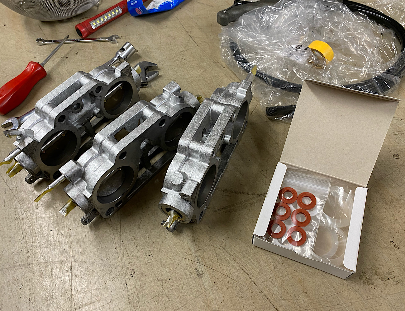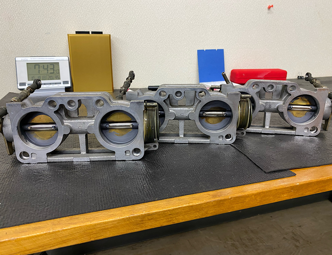 スロットルバタフライの全閉を調整した後にコーティング塗料を塗り、スロットルを3基付けてから更にバランス調整をします。