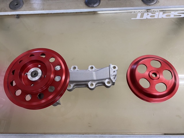 これはパワステアリングからクランクプーリーまでのベルトの長さが長く、レース中にベルトが脱落してしまうと言う欠点を解消する為、ウォーターポンププーリーからパワステプーリー間を短いベルトで繋ぐ事で欠点を解消していました。