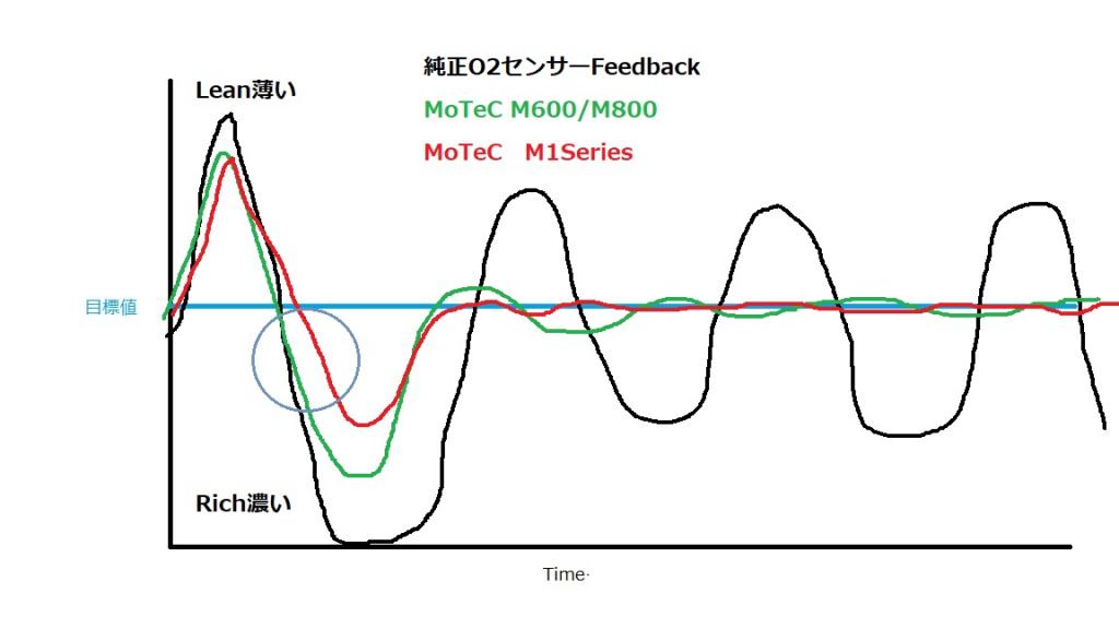 M600/M800系は瞬時に目標値に対して減量を計算しましたが、M1に比べ処理が遅かったために、空燃比を少し薄くしすぎ、もう一度濃くしているのが時間の経過で分かると思います。
