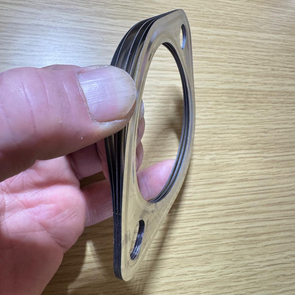 今回試作したマフラーメタルガスケットは、ステンレス製の5層構造でビード部4枚センター1枚でフランジ面の歪みにも追従し対応できるよう設計しております。