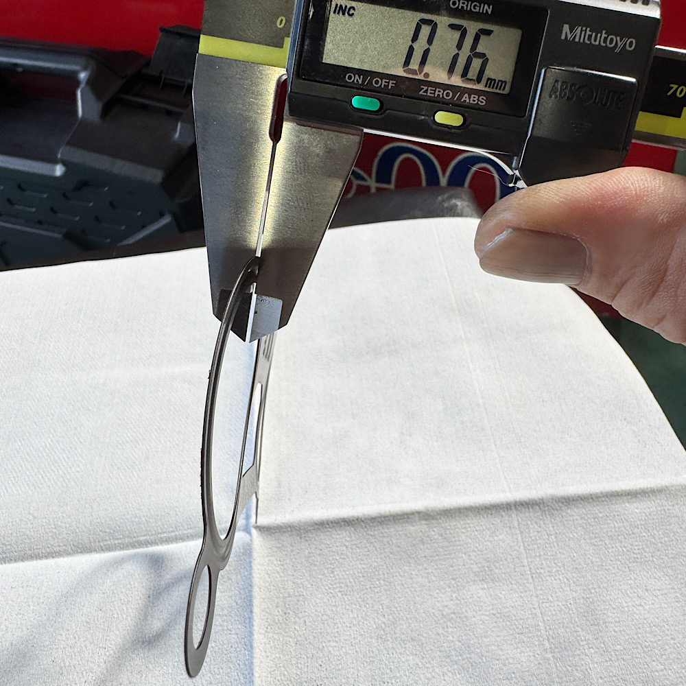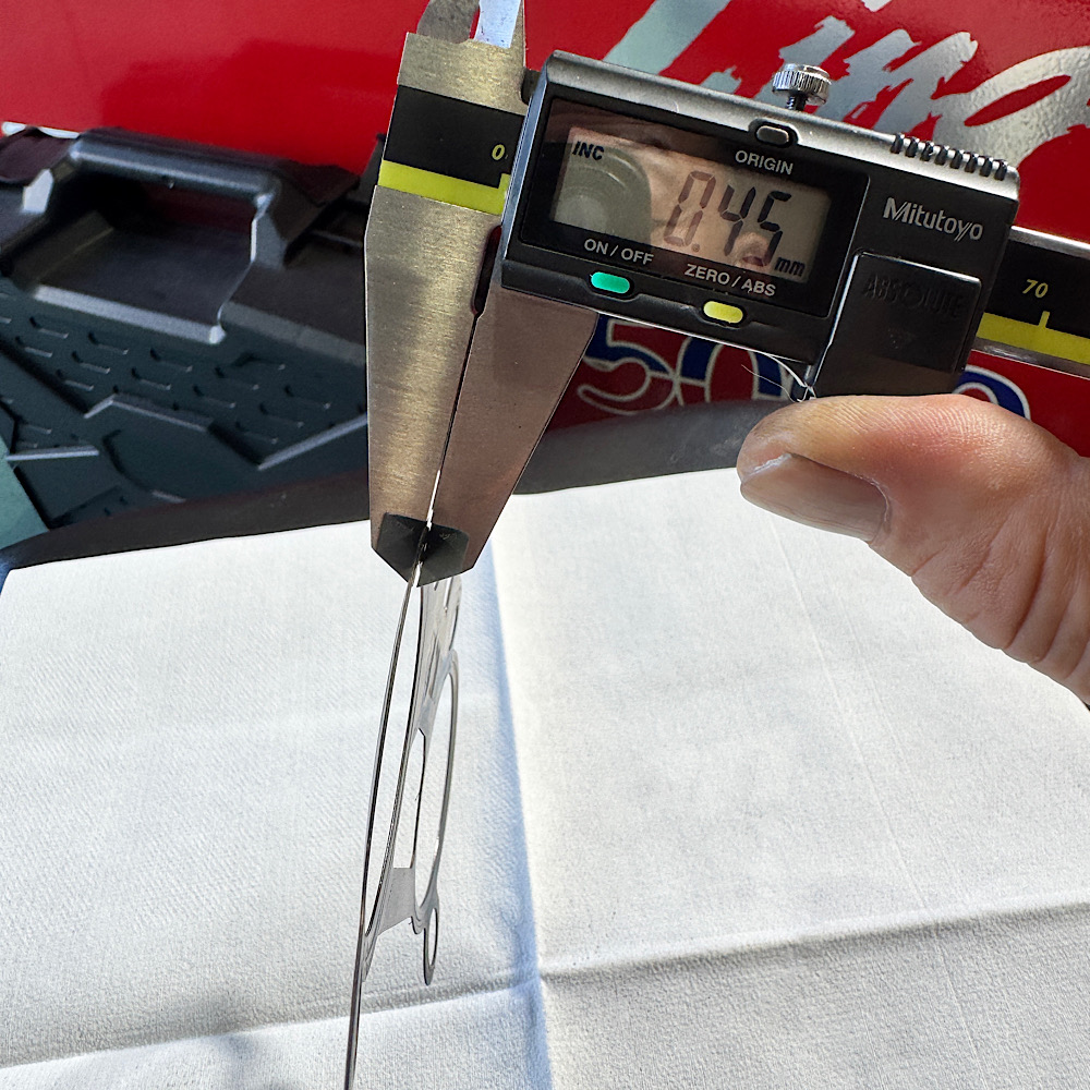 メタルスロットルガスケットを規定トルクで取り付け、翌日に取り外して測定すると、ビード山は完全に潰れて全厚0.45mmになっていました。