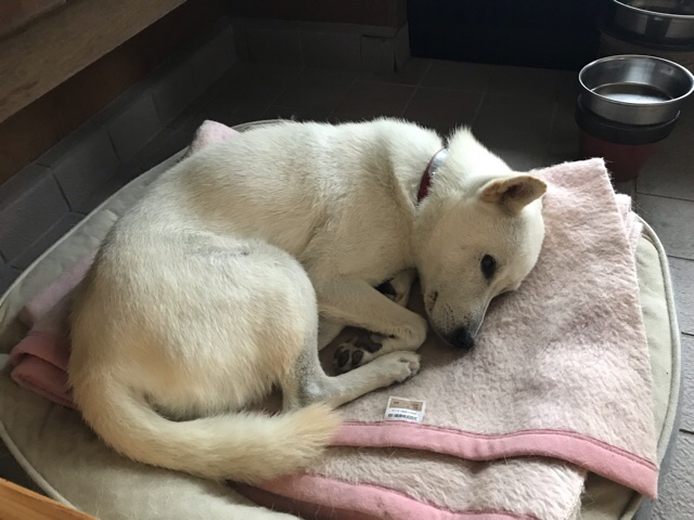 実家の愛犬も、雨でさんぽもつまらなく、意気消沈、、、