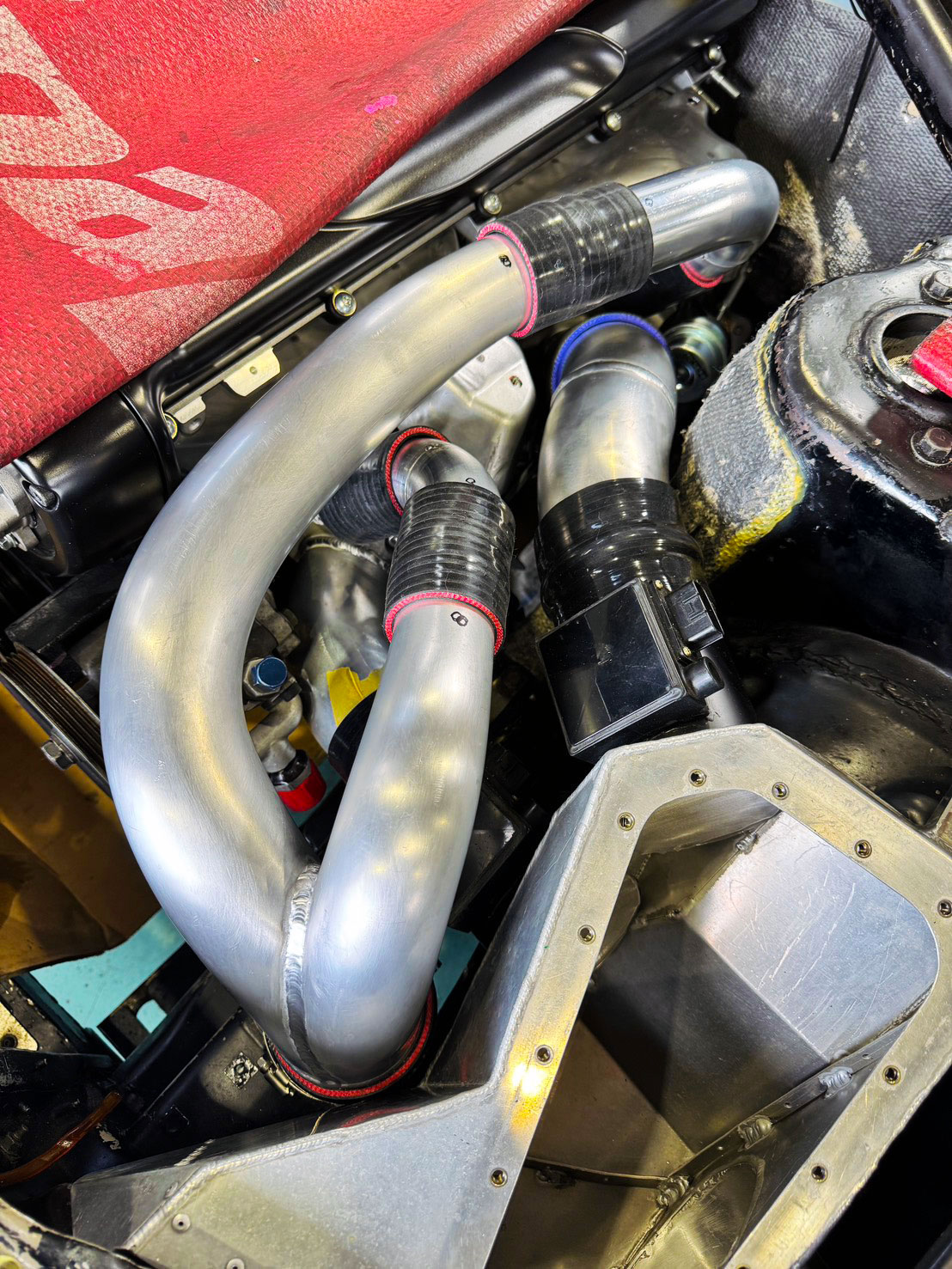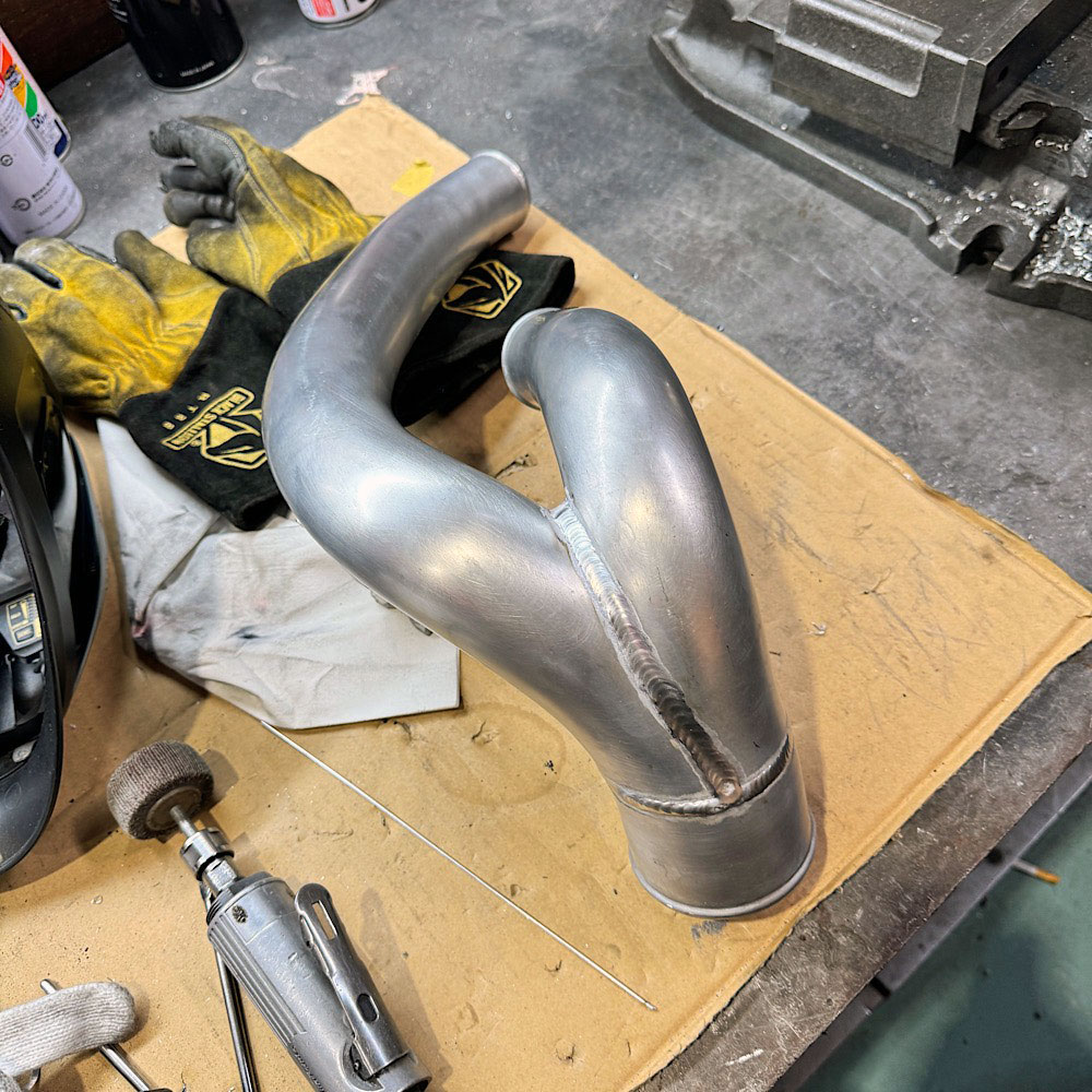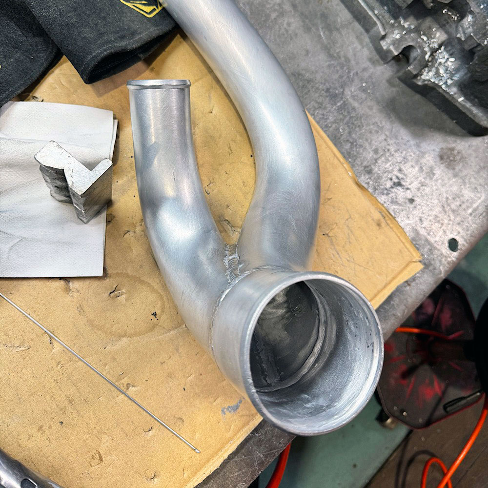 一般的に市販されている社外パーツとは形状がまったく違い、タービン出口から徐々にパイプ径が太くなるテーパー形状になっています。