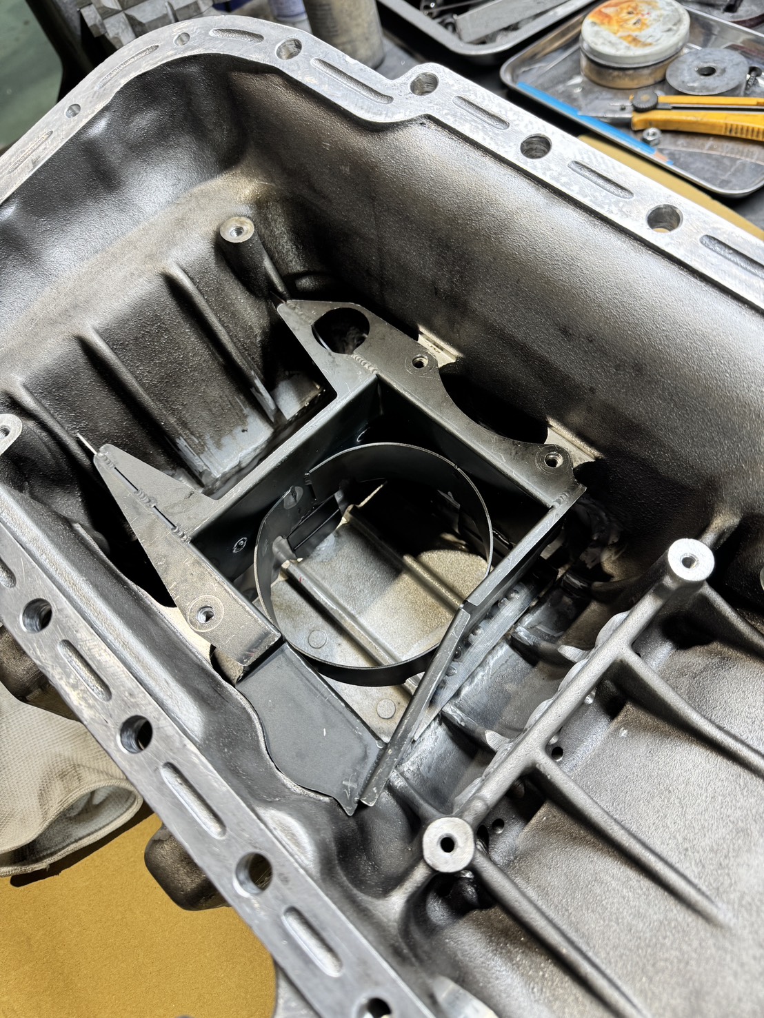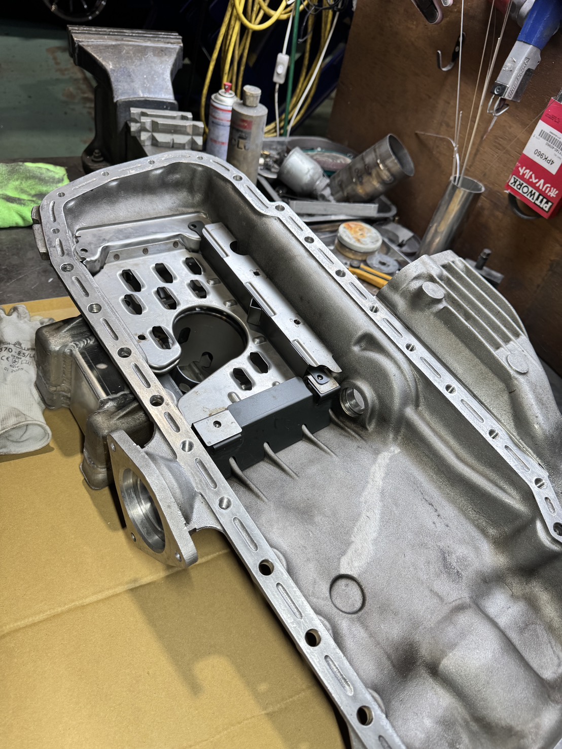 さらに、走行中にオイルが一方向に片寄ってしまうと油圧が不安定になるため、オイルの動きを制御するバッフルプレートも同時に製作しました。